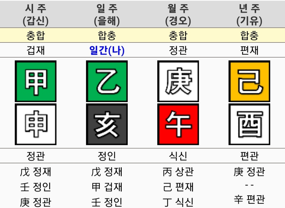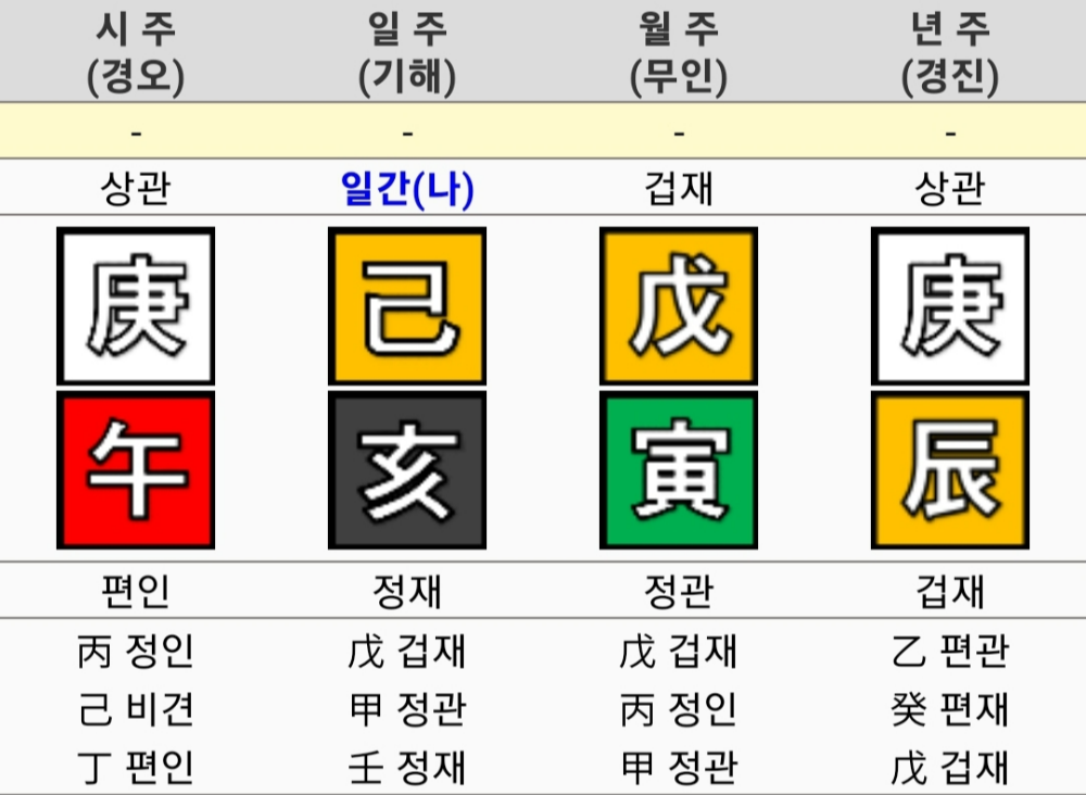- 일주: 출생일의 천간지지 (예: 무오일 → 무오)