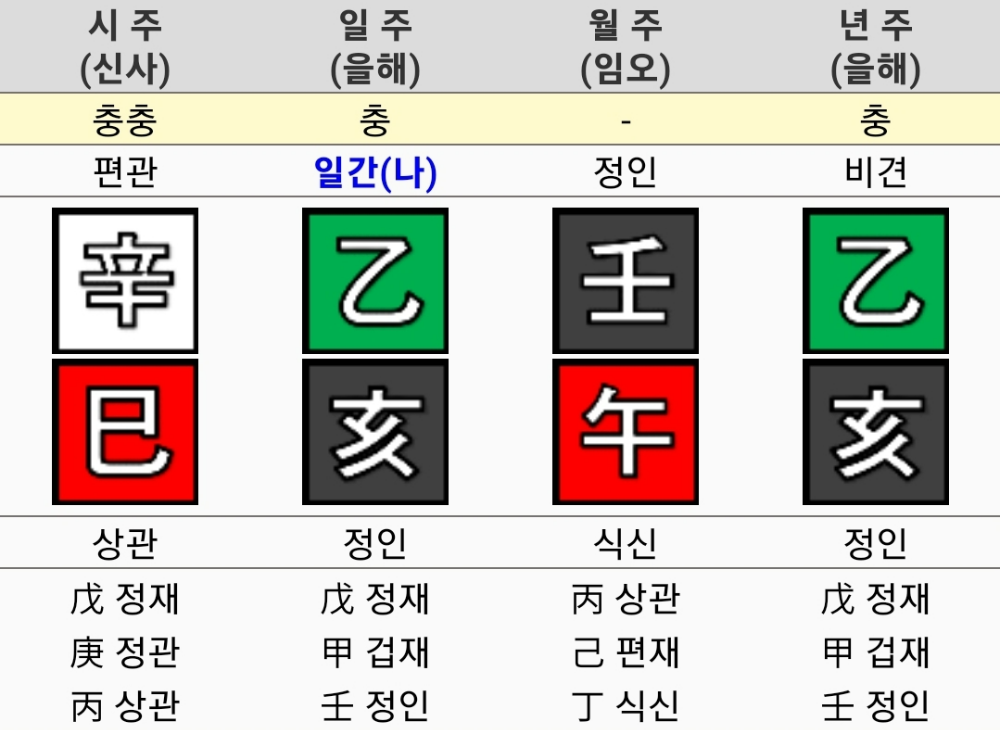 충이나 형: 기둥 간에 충이나 형이 있으면 해당 영역에서 변화나 갈등이 많을 수 있습니다. 하지만 이것이 반드시 나쁜 것은 아니며, 변화를 통한 발전의 기회가 될 수도 있습니다.