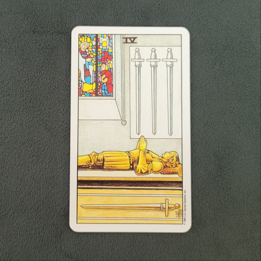 검 4번은 외부적인 활동의 중단과 내면의 회복을 의미합니다. 당신은 지금 육체적, 정신적으로 지쳐 있을 수 있습니다. 이 카드는 이 시기에 억지로 무언가를 하려 하기보다는, 충분한 휴식을 통해 에너지를 회복해야 함을 강조합니다.