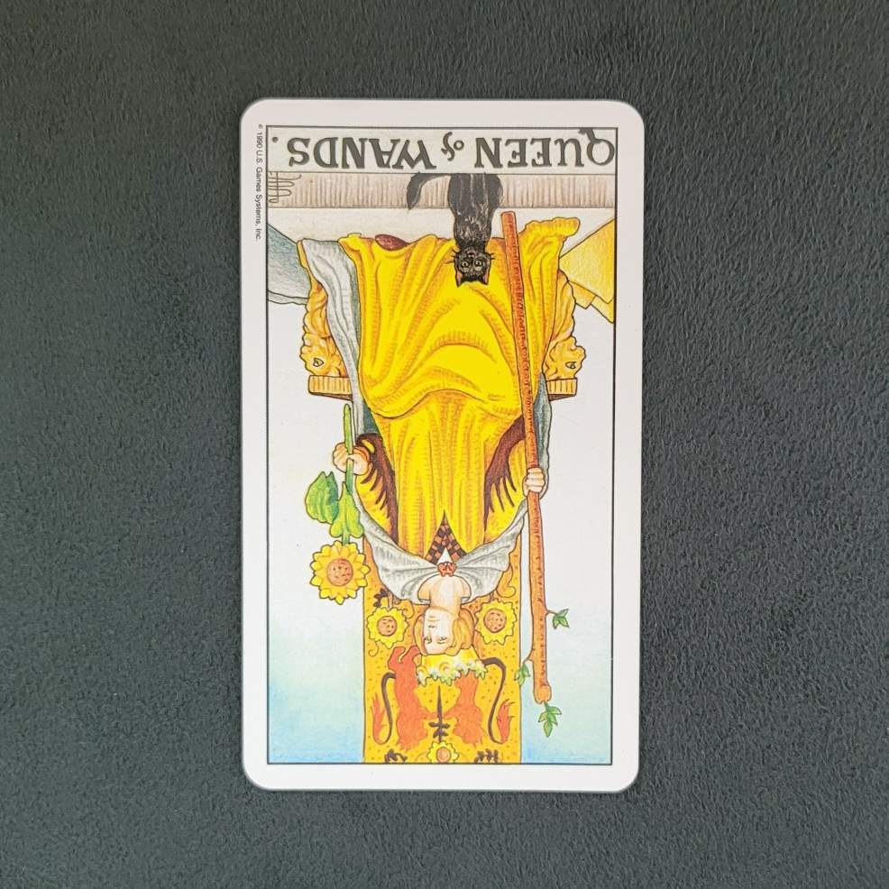 지팡이 여왕 카드가 역방향으로 나왔다면, 자신감이 지나쳐 독단적이고 오만한 태도를 보이거나, 내면의 불안정함을 드러낼 수 있습니다.