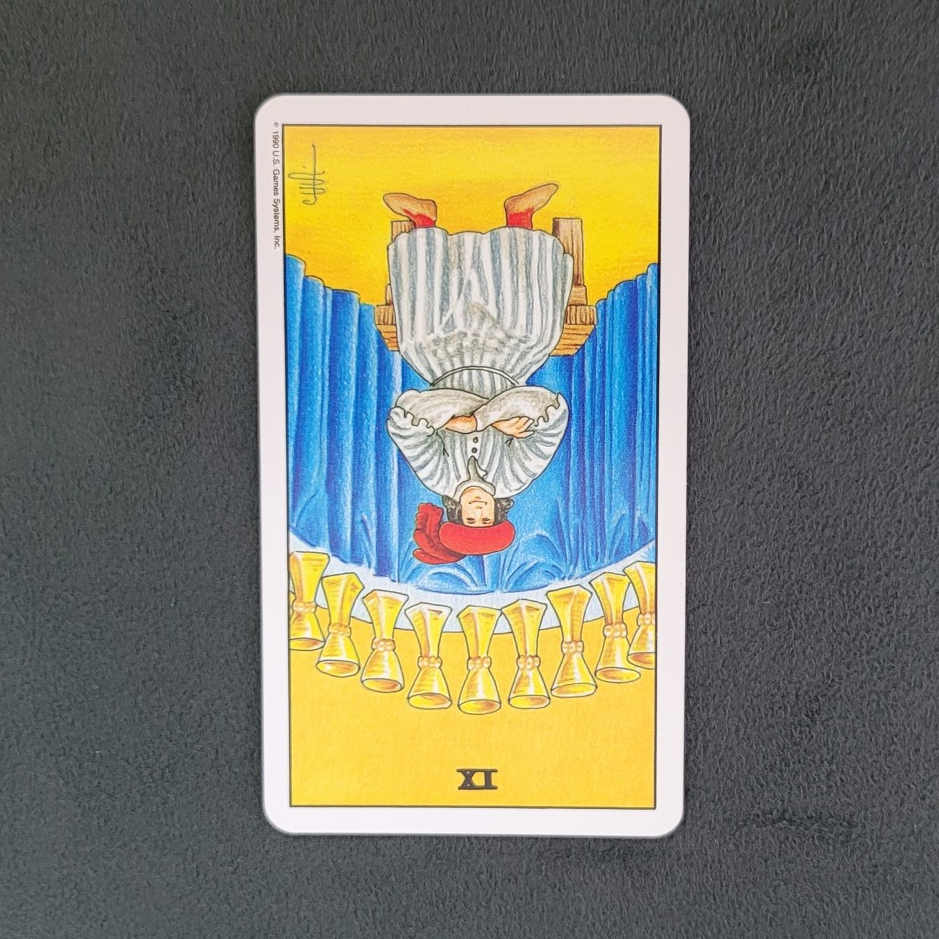 - 배경의 9개 컵: 인물의 뒤편에는 9개의 컵이 가지런히 놓여 있습니다. 이는 그가 물질적, 감정적으로 모든 것을 갖추었음을 나타내며, 풍요롭고 만족스러운 상태를 보여줍니다.