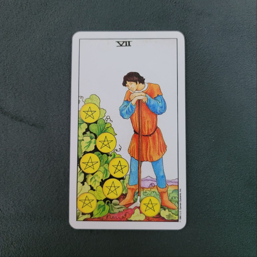 펜타클 7번은 노력에 대한 중간 점검을 의미합니다. 당신은 지금 어떤 프로젝트나 관계에 많은 시간과 에너지를 투자했을 수 있습니다. 이 카드는 이 시점에서 그 투자가 과연 옳은 방향으로 가고 있는지, 앞으로도 계속해야 할지 고민해야 함을 알려줍니다.