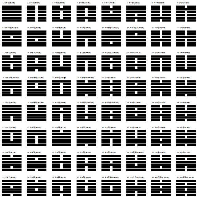 주역의 핵심은 바로 64괘에 있습니다. 괘는 여섯 개의 선으로 이루어져 있으며, 각 선은 음(陰)과 양(陽)을 상징합니다. 이 선들은 두 가지 형태로 나타납니다: 하나는 끊긴 선(음), 다른 하나는 이어진 선(양)입니다. 이 조합이 모여 64가지의 괘가 형성되며, 각 괘는 특정한 상황이나 변화를 의미합니다.